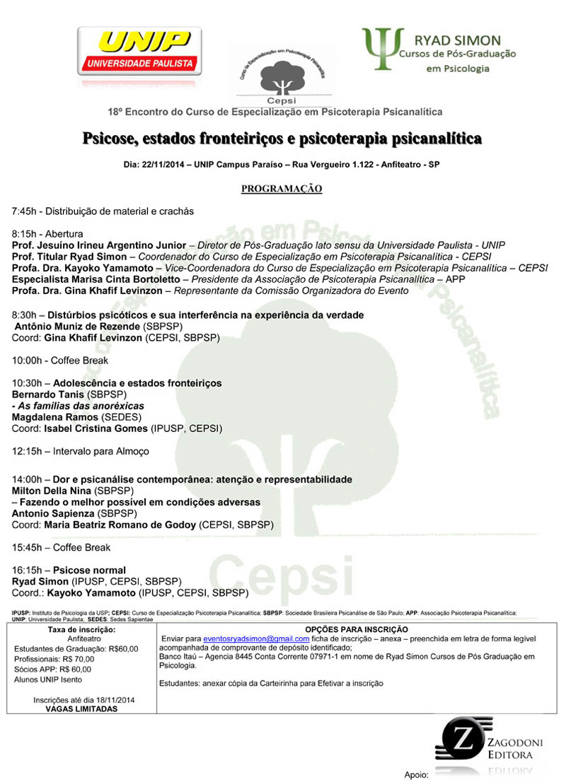 Curso/Evento: 18º Encontro do Curso de Especialização em Psicoterapia Psicanalítica