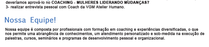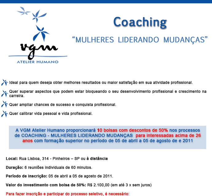 | | Vivian Galvão |  | Sênior Coach credenciada internacionalmente pelo ICF (International Coach Federation), em andamento o PCC - Professional Certificate Coach pelo ICF (International Coach Federation), certificada em Coaching pelo ICI (Integrated Coaching Institute), tem graduação em Psicologia pela PUC-SP, com especialização em Gestão Estratégica de Pessoas pelo SENAC, MBA em Desenho e Gerência de Políticas Públicas e Programas Sociais pelo INDES (Instituto Interamericano para El Desarrollo Social). Certificada em empreendedorismo por Babson College. |  | Qualificada nos instrumentos MBTI®, DISC®, PI®, HOGAN®. |  | Profissional com carreira na área de Recursos Humanos e Desenvolvimento Organizacional vivenciando e conduzindo processos de reestruturação e mudanças organizacionais, envolvendo: gestão de RH, implantação de Universidades Corporativas, centros de desenvolvimento, gestão de conflitos, gestão pessoal, transição e gestão de carreiras, gestão do conhecimento e gestão por competências, orientação profissional, além de Executive Search, Assessment Center e Coaching. |  | Sócia-diretora da VGM Atelier Humano, FGY e Coach com experiência em processos de Stress & Adversity Coaching, Executive Coaching, Career Coaching, Intercultural Coaching e Life Coaching. |  | Ministra aulas e palestras em cursos de MBA, graduação e pós graduação, abordando diversos temas estratégicos de Recursos Humanos, Empreendedorismo, Coaching de Carreira, Coaching Empreendedor, Liderança Transformadora e Gestão Sustentável. |  | Atuou na Área Pública, como Assessora da Secretaria de Assistência Social de SP, em programas profissionalizantes voltados aos jovens e a mulher e Coordenadora Geral de Projetos na Área Educacional. Atuação em grupos sociais de Women’s Leadership. |  | Vivian é coach certificada desde ano 2003 e tem mais 3000 horas reconhecidas de processo de coaching. | | Mônica Priante |  | Formação e Certificação Internacional em Coaching Integrado – Integrated Coaching Institute. |  | Qualificada nos instrumentos MBTI®, DISC®, Hogan®. |  | MBA em Administração de Empresas e Gestão de Pessoas pela FAAP/SP. |  | Pós-Graduada em Gestão de Negócios pelo SENAC/SP |  | Carreira de 15 anos ocupando cargos de Direção, Gerencial e Técnico, em empresas nacionais e multinacionais. A experiência com gerenciamento de pessoas, levou a descoberta do Coaching, como ferramenta de desenvolvimento de pessoas e organizações. |  | Atualmente Diretora da VGM Atelier Humano e FGY. Vasta habilidade em liderança e formação de equipes, desenvolvendo e conduzindo, treinamentos de liderança com ferramentas de coaching, programas de formação gerencial, avaliação e feedback em 360º, programas de atração e retenção de talentos, além de planejamento e execução de treinamentos operacionais, técnicos, administrativos e comportamentais. |  | Ministra aulas e palestras em cursos de pós-graduação em universidades como: UNIP, IBTA abordando os temas: Planejamento Estratégico, Gestão de Negócios e Comércio Exterior, Gestão de Carreira, Coaching Executivo, Coaching Empreendedor e Coaching de Vida. |  | Experiência na área de Física Quântica, aplicação de conceitos da energia quântica, como uma possibilidade de ferramenta para o crescimento pessoal de líderes. |  | Atuação em grupos sociais de Women’s Leadership. |  | Mônica é coach certificada desde ano 2005 e tem mais 2500 horas reconhecidas de processo de coaching. | |  |