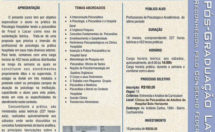 Curso/Evento: Curso de Especialização em Psicologia Hospitalar: A intervenção Psicanalítica no Hospital Geral