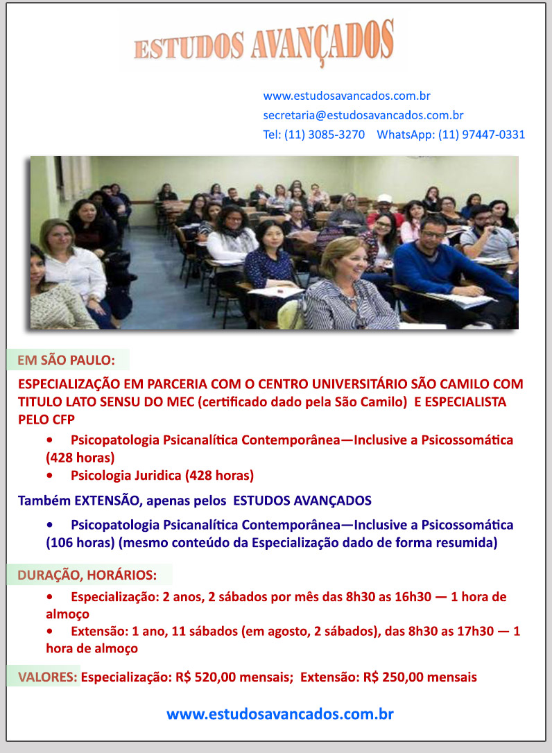 Especialização MEC e CFP: Psicopatologia, Psicossomática, Psicologia jurídica. Também Extensão