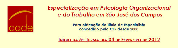 O Curso de Especialização do CADE foi credenciado em Julho de 2008 e formou 3 turmas de Especialistas em Psicologia Organizacional. Nos dias 05 e 06 de Dezembro de 2012 recebemos a visita dos vistoriadores indicados pela ABEB para novo credenciamento que terá vigência até 2014. Recebemos o parecer favorável e aguardamos a atualização do site no retorno do recesso de final de ano do Conselho.