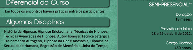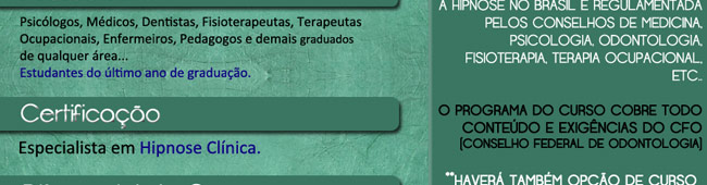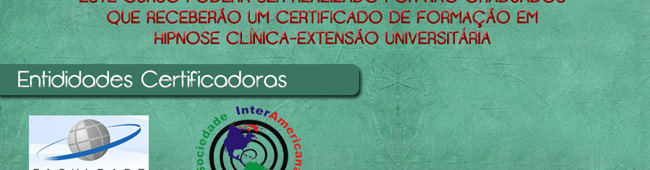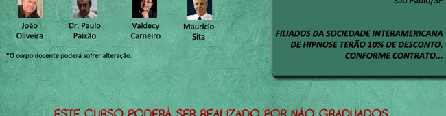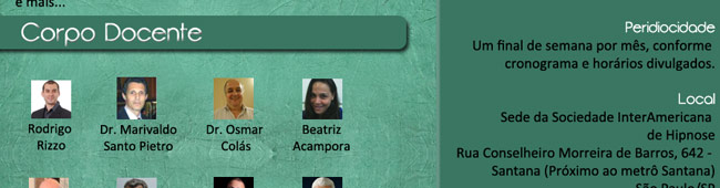 OBJETIVO GERAL Capacitar profissionais para o uso clínico da Hipnose, gerando qualidade e otimização de resultados. Formação de Especialistas em Hipnose Clínica (reconhecidos pelo MEC) pela Sociedade InterAmericana de Hipnose. OBJETIVO ESPECÍFICO Habilitar profissionais para utilizar a hipnose na prática clínica, aproveitando como estratégia de comunicação eficaz, otimizando a relação clínico/cliente, levando o cliente a um melhor uso de suas capacidades mentais. Promover bem-estar e qualidade de vida. LOCAL Sede da Sociedade InterAmericana de Hipnose Rua Conselheiro Moreira de Barros, 642 – Santana (próximo ao Metrô Santana) São Paulo/SP *ALGUMAS DISCIPLINAS História da Hipnose História da Hipnose no Brasil Técnicas de Hipnose Técnicas Avançadas de Hipnose Hipnose Ericksoniana Auto-Hipnose Programação Neurolinguística e Hipnose Neurociências e Hipnose Técnica Letárgica Hipnose na Odontologia Treinamento Autógeno Hipnose na Sexualidade Humana Hipnose na Dor e Anestesia Hipnose Cognitiva Hipnose na Aprendizagem Regressão de Memória e Linha do Tempo Hipnose nos Transtornos do Humor Hipnose nos Transtornos Alimentares Hipnose nos Transtornos de Ansiedade Hipnose na Dependência Química Coaching Hipnótico® ou Hipnocoaching® Ética Profissional Psicopatologia Geral Docência do Ensino Superior Metodologia Científica Apresentação de Monografia * Algumas disciplinas poderão sofrer alteração no nome e/ou conteúdo... ** CORPO DOCENTE Dr. Giancarlo Russo (Itália) – Fisioterapeuta – Presidente da (AIRI) Associazione Italiana Ricerca Ipnosi Rodrigo Rizzo – Fisioterapeuta – responsável pelo Instituto do Movimento e Prevenção da Dor em São Paulo e realiza pesquisas científicas no Departamento de Ciências Fisiológicas da Faculdade de Ciências Médicas da Santa Casa de São Paulo. Dr. Osmar Colás – Médico Tocoginecologista, Mestre em Obstetrícia, Especialização em Psicoterapia Cognitivo Comportamental – UNIFESP, Hipnoterapeuta, Coordenador do Grupo de Estudos de Hipnose – UNIFESP. Dr. Marivaldo Santo Pietro – Cirurgião-Dentista, Diretor do Departamento de Hipnose da APCD (Associação Paulista de Cirurgiões Dentistas) João Oliveira – Psicólogo e Publicitário – Mestre em Cognição e Linguagem pela UENF, Diretor de Cursos do ISEC - Instituto de Psicologia Ser e Crescer Beatriz Acampora – Psicóloga e Jornalista – Mestre em Cognição e Linguagem pela UENF, Diretora do ISEC - Instituto de Psicologia Ser e Crescer Valdecy Carneiro – Psicólogo, Programador Neurolinguísta, Coach – Presidente da Sociedade InterAmericana de Hipnose Dr. Rodrigo Moraes – Médico Neurocirurgião – Sócio Diretor da Clínica ComVida Dr. Paulo Paixão – Psicólogo – Maior expoente e divulgador da Técnica Letárgica. Autor de 6 livros sobre Hipnose. Ministrou cursos sobre Hipnose em todos os países da América Latina, além de Europa etc. **O Corpo Docente poderá sofrer alteração... FILIADOS DA SOCIEDADE INTERAMERICANA DE HIPNOSE TERÃO 10% DE DESCONTO, CONFORME CONTRATO... INFORMAÇÕES & INSCRIÇÕES sociedadedehipnose@hotmail.com (11) 3492-7357 (11) 2339-7791 (11) 9282-5650 Claro (11) 7303-8814 Vivo (11) 6360-0511 Tim (11) 6888-3686 Oi www.sociedadeinteramericanadehipnose.com |