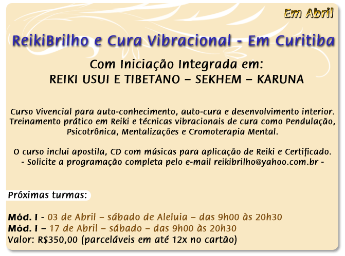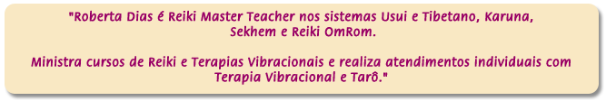 A Cura Vibracional é a Canalização da Energia Cósmica Universal para uma pessoa, um ambiente ou qualquer ser vivo. Ela atua na matriz informativa do agrupamento dos átomos alterando a frequencia vibratória para um padrão mais elevado e harmonioso. Aliada a programação interior correta, traz a cura de dentro para fora, equilíbrio e realização! |  Reiki Usui e Tibetano - I, II, III e Mestre Karuna - I, II e Mestre Sekhem-SKHM - I, II, III e Mestre Cursos apostilados, com certificado  REIKI E TERAPIA VIBRACIONAL LEITURA DO TARÔ EGÍPCIO On-line de segunda a sexta-feira das 14h as 21h "Espelho de Luz quem és tu, senao o meu reflexo; quem sou eu senao minha própria Luz..." Entre em contato pelo e-mail robertaholistica@hotmail.com e agende seu horário. |  |
