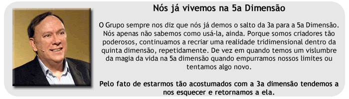 Data: 1 e 2 de agosto - Seminário Vivendo na 5a Dimensão Horário: 10:00 às 17:00 hs Valor: US$ 220,00 até 26/06 (pagamento através de Cartão de Crédito Internacional) US$ 260,00 de 29/06 até 29/07 (pagamento através de Cartão de Crédito Internacional) Neste seminário você aprenderá e praticará formas de evitar as "armadilhas" da 3a dimensão e dará um passo para a 5a dimensão e para uma maneira mágica de viver. Este seminário lhe oferecerá ferramentas práticas e exercícios para lhe mostrar como você pode experimentar a vida na 5a dimensão. ________________________________________________________